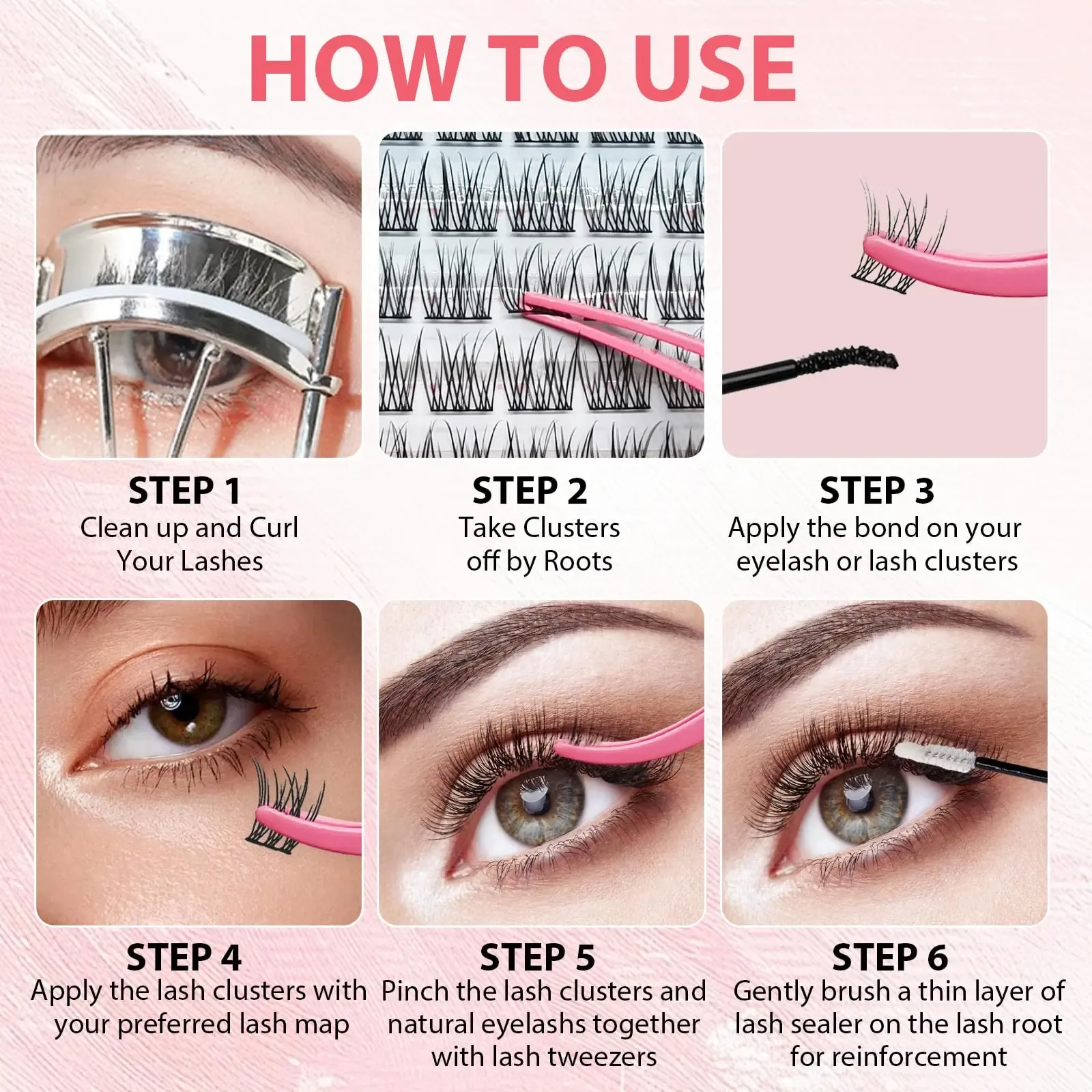 【Eyelash Extension Kit】: You will get a eyelash extension kit which includes 1 tray of individual lashes, 1 lash tweezer and 1 lash bond. The wispy cluster eyelash extension kit provides everything you need to effortlessly create DIY lash extensions at home.【Salon-Grade Customization】: Featuring a range of lengths from 9mm to 12mm, natural individual lashes band is made of clear soft fibers, and the clear lashes clusters band is comfortable to wear. Mix and match the lengths to suit your style and preferences.The fluffy lash clusters enhances your overall appearance, delivering a striking and enchanting gaze.